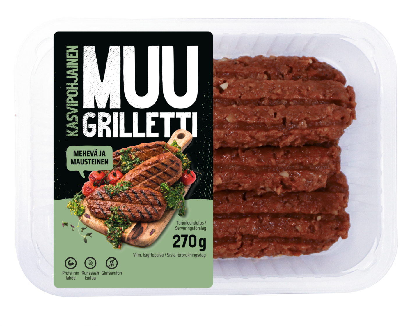 MUU Grilletti on täällä taas! Mehevä grilliherkku paistuu muutamassa minuutissa ja sopii tarjoiltavaksi grillikasvisten ja muiden kesäherkkujen kanssa. Grillitassumainen tuote sopii täydellisesti myös hampurilaisen väliin pihviksi.